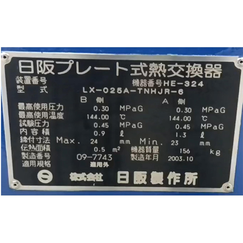 日阪製作所社製 プレート式熱交換器 LX-025A-TNHJR-6型です。